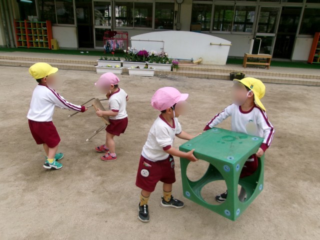 戸外遊び後のお片付けでは、4歳児黄組が「一緒にしよう」と誘ってくれ、片付ける場所を優しく教えてくれました。