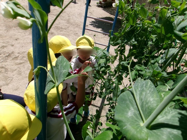 戸外では、スナップエンドウの収穫をしました。年長緑組が「たくさんあるから黄組さんも取っていいよ」と言ってくれました。子どもたちはとても喜んでいました。