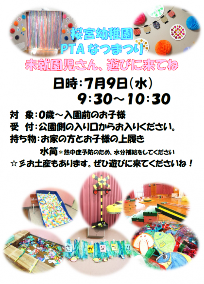 未就園児の皆さん、桜宮幼稚園のPTAなつまつりに遊びに来ませんか? 詳細は、以下...