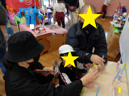 お家の人に見てもらって、一生懸命作品のお話をしている子どもたち。沢山褒めてもらっ...
