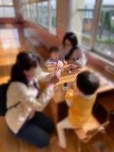 誕生児と保護者のふれあい遊びは、新聞ゲームでした。 新聞紙の上に親子で立ちます。...