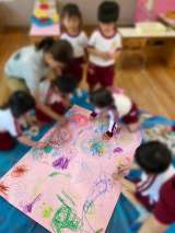 3歳児桃組さんは、大きな紙にパスでお絵かき… みんなでグルグル、腕を動かして遊び...