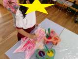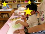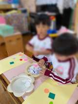 3歳児桃組が、幼稚園で初めて製作をしました。 机に向かって座り、鯉のぼりの体に鱗...