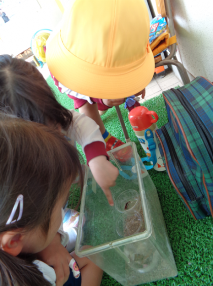 4歳児黄組では、ダンゴムシを見つけて集めることがブームです。「ここにいるで」とプ...