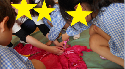 5歳児年長緑組は、絞り染めをしました。 大きな白い布をちょっとつまんでビー玉をく...