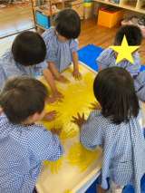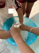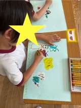 4歳児黄組は、指絵の具で遊びました。「今日は、魔法の絵の具を持って来たよ」と先生...