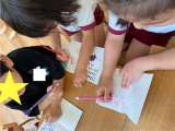 クイズの本づくり、問題は文字で、答えは絵でかきます。文字は先生に書いてもらいます...