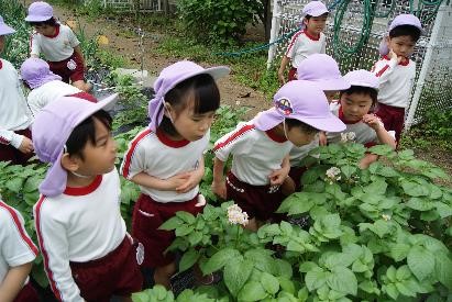 雨の止み間にSUNサンファームへ 公開日 2024/05/01 更新日 2024/05/01 園の様子 朝から雨模様だったので、遊戯室で5歳児4歳児で体操をして遊びました。 雨の止み間にSUNサンファームに行くと、、、、 ジャガイモの花が咲いているのを見つけました。 よく見ると色は少し白くて、紫色でした。匂ってみると、「いい匂い」「ちょっと、、、」等いろいろな感想が聞こえてきました。 花が咲き終わると、もうすぐ収穫です。たくさんのじゃがいもができてそうですね。 いいね(0)