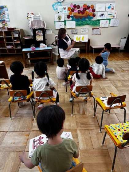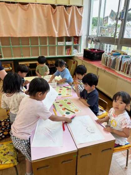 お外で遊んだ後は、お部屋で絵本を見たり、お絵描きをしたりして過ごしています。