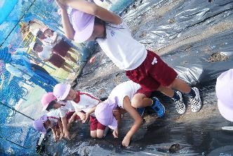 園庭の青いネットには青首大根、サンサンファームには聖護院大根、