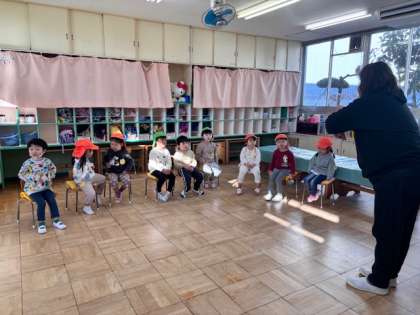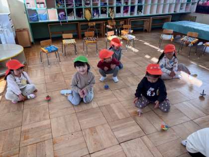 今日は、一段と寒い日になり、室内での活動です。先生と一緒に手遊びを楽しんだり、おうちの人と絵を描いた手回しゴマを回して遊んでいます。身体を使った昔遊びも大切にしています。