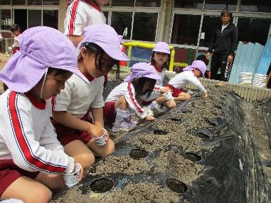 18日火曜日には、とうもろこしの種植えをしました。3粒ずつ数えて、事業担当主事さんが空けてくれた120個の穴にそっと入れました。早く芽が出ますようにと、お願いしている子どもたちの姿がありました。
