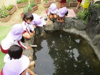 園庭の池にざりがにを発見。そっとのぞいて、じっとしていると、、、、