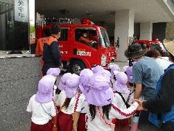 昼からは、隣りの江成公園にお散歩に行きました。消防署を前から見学させてもらうと、消防車を移動するところを見せてもらいました。