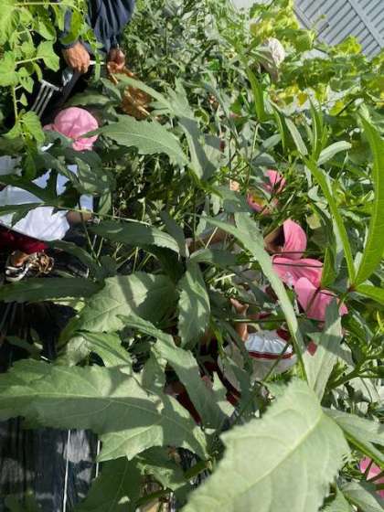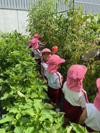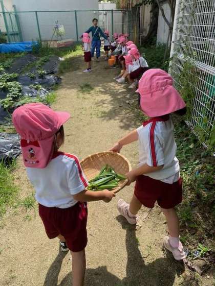 4歳児の子どもたちが、七夕のお供えにするために、夏野菜を収穫しました。