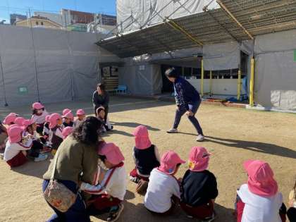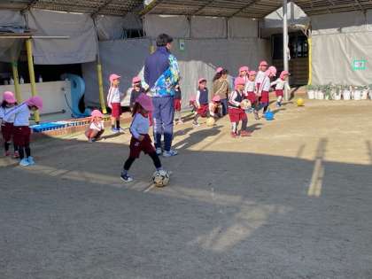 今日は、英語にふれあう機会をと考え、英語でのサッカー教室からコーチを迎えて、英語とサッカーを教えて頂きました。