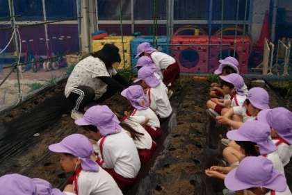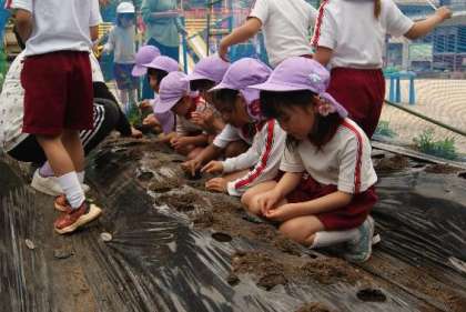 トウモロコシの種をじっくり観察して、主事さんが空けてくれた畝の穴に丁寧に置いて植えました。1・2・3と数えながら、3つずつ植えました。
