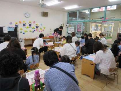 その後は、雨天だったため、お家の方と一緒にこいのぼりの製作をしました。