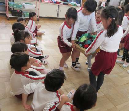 5歳児が毛糸を使って二十日大根をつくりました。つくった二十日大根をSUNサンファームに見立てた畑に植えて、二十日大根の収穫ごっこが始まりました。「よいしょ、スポン、二十日大根抜けた!」「ここの穴は二十日大根二つできてるねん」「なんかいい匂いしてきたわ」など収穫ごっこを楽しんでいました。さくら組(4歳児)にも見せにいきました。本物の二十日大根の収穫も楽しみですね。