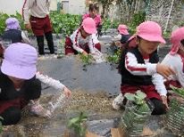 「優しくペットボトルに入れてね」と伝えると、「入るかな〜」と優しくそっと入れている姿が見られました。支柱は伸びてきたときに倒れないように必要なんだよという話を聞きながら、去年の畑の様子も思い出して「森みたいになってたもんな〜」と、なぜ、風よけや、支柱がいるのかを考えながら取り組むことができました。