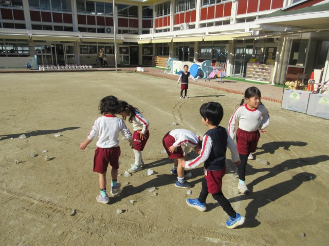 園庭に出るとソリの跡を見つけて「ここにとめていたんちゃう?」「ここから飛んで行ったのかな?」と楽しそうに話していました。