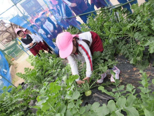 2学期に収穫した二十日大根、青首大根、田辺大根に続き、今回は聖護院大根です。