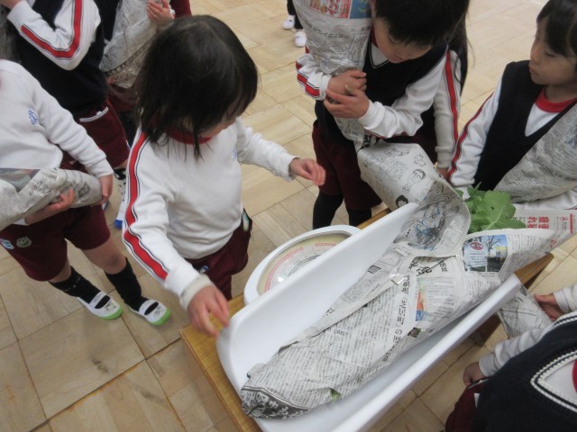 「大きい!」「重たい!」と驚いたり、友達と見比べたりしながら、「聖護院大根はまん丸してるね!」とこれまでに収穫した大根との違いにも気付いていました。