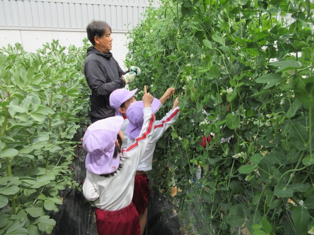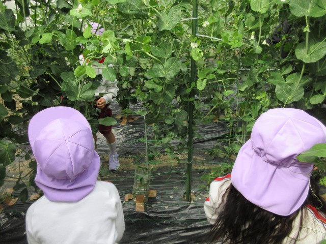 4歳児さくら組の時に植えたスナップエンドウが、いつのまにか子どもたちの背を超えてたくさんの実をつけていました。