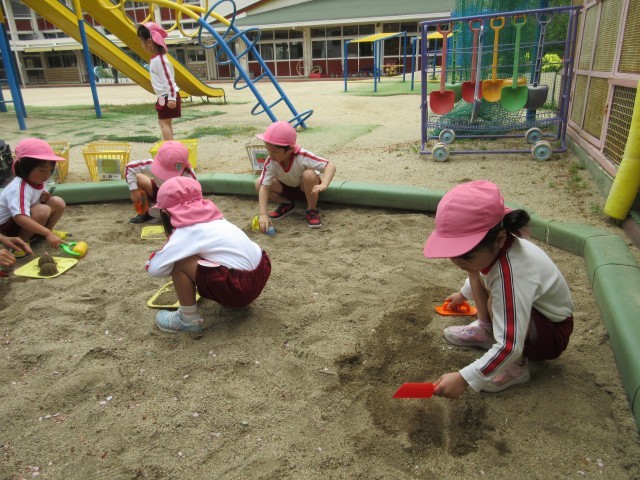 園庭探検をして園庭での約束を聞いてから、砂場やスクーター、遊具など、好きな遊びをして遊びました。
