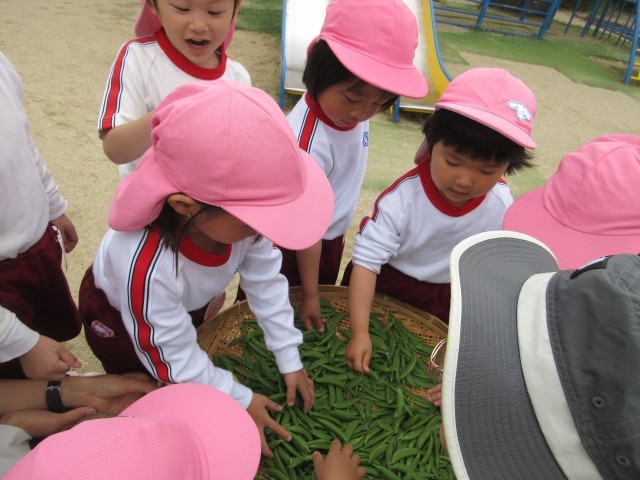 ふじ組さんが収穫したスナップエンドウも見せてもらうと、たくさんのスナップエンドウに驚いていました。(なんと、684個収穫できました)