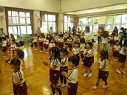 誕生会の後半は、全学年が遊戯室に集まって園長先生に絵本を読んでもらったり、みんなで体操をしたりして楽しく過ごしました。