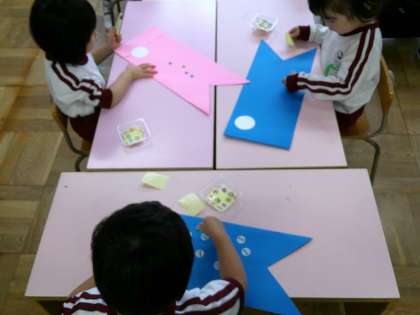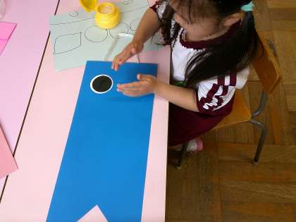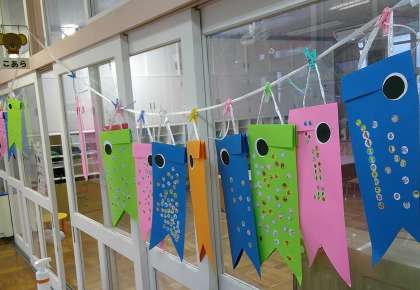 こいのぼりをつくったよ! 公開日 2024/05/09 更新日 2024/05/09 3歳児 こいのぼりが園庭にあがると、「おおきいね〜」「うごいてる〜」と興味をもって見上げています。こあらぐみにも遊びにきたこいのぼりに、シールで模様をつけ、糊で目を貼って、自分のこいのぼりを仕上げました。好きな絵柄のシールを選び、次々に模様をつけ「たりない」「もっと」というくらい夢中になって貼っていっていました。こいのぼりはお部屋の前に飾っています。元気に泳いでいます! いいね(0)