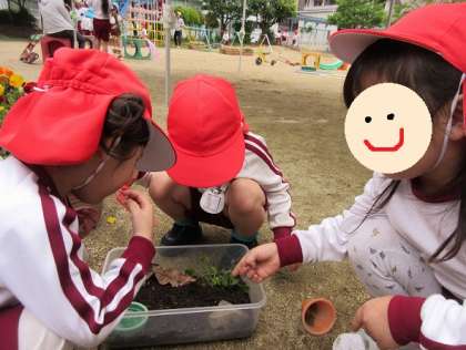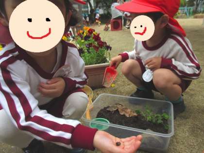 「大きいのはお父さんかな」「こっちはちょっと小さいから赤ちゃんかも♪」と嬉しそうに友達と見つけると「お家に入れてあげよ!」とケースに土を入れて、ダンゴムシの家をつくりました。