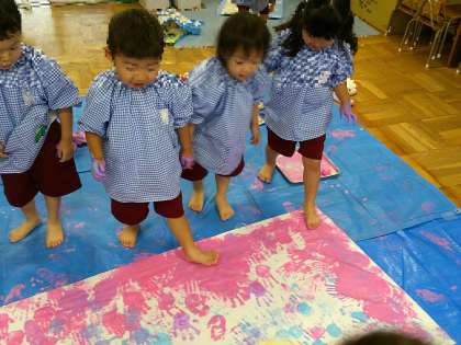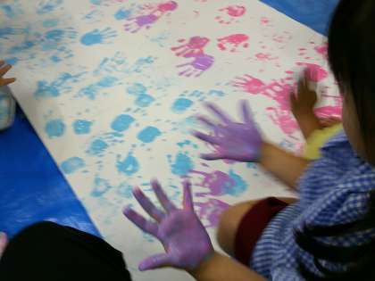 初めは、ピンク、水色、紫それぞれの色を楽しみながら手をぺたぺたして楽しんでいましたが、だんだんと両手に絵の具をつけたり、手で塗り広げたり、右手と左手で違う色を付けて混ぜ合わせてみたり…