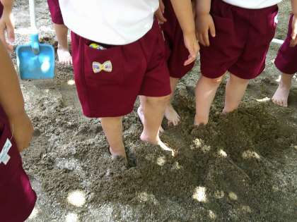 何度も足に砂をかけて足が見えなくなるのを楽しんだり、教師や友達とかけあいっこをしたりしました。