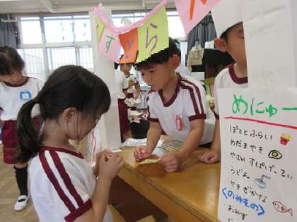 「いらっしゃいませー」「何が食べたいですか?」「こっちでお魚焼けますよー」と、お店屋さんの元気な声が聞こえてきます♪