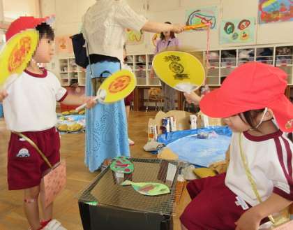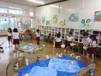 ばら組では、お客さんにレストランでごちそうをつくってあげたり、子どもたちで考えた魚釣り屋さんでは、釣った魚を網で焼いてお客さんに出したりて遊ぶことを楽しんでいます。