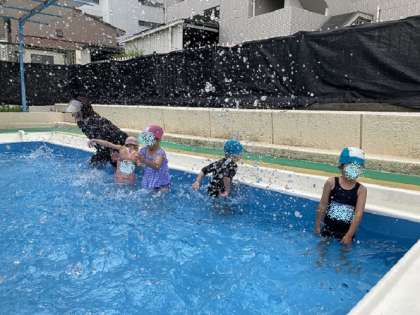 「冷たいー!」「きもちいい〜」「きゃー!」と笑顔いっぱいの子どもたち。