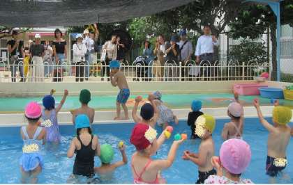 回数を重ねるごとに、少しずつ水にも慣れて、水をかけあいっこしたり、顔をパシャパシャ洗ってみたり、いろんなことに挑戦する姿も見られてきました。