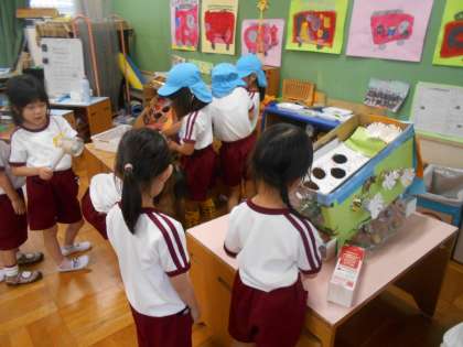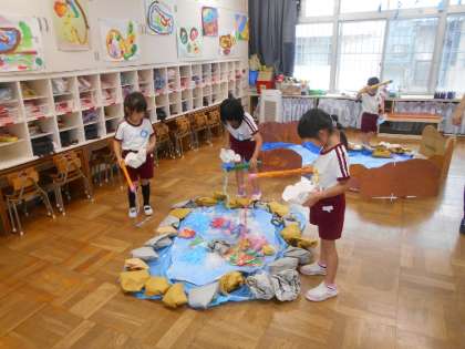 各クラスのお店には、魚釣りやスマートボールなどいろいろな遊びがあり、子どもたちは目を輝かせながら遊んでいました。遊び方を聞いたり、教えたりと友達同士で言葉を伝えあいながら遊んでいました。振り返りの際にも「魚釣りでたくさん魚が釣れたよ」、「みんなのお店に遊びに行くの楽しかった」ととっても楽しんでいる様子が伝わってきました。