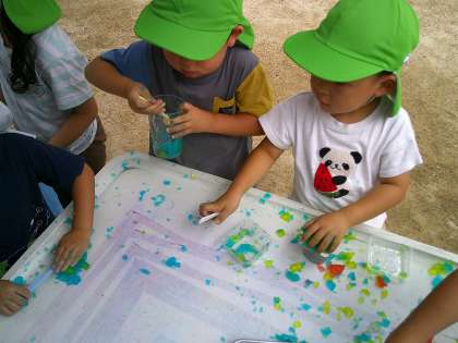 寒天で遊びました。はじめは指先や手のひらで触れ、「ぷるぷるしてるー!」「つめたーい」と子どもたち。握ってみると崩れていく面白さに気付き、何度も握って練って遊ぶことに夢中です。握れば握るほど、状態が変化していくことにも興味津々な様子でした。小さく崩れた寒天を今度は容器に入れてジュースやゼリーをつくって遊びました。