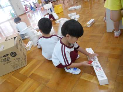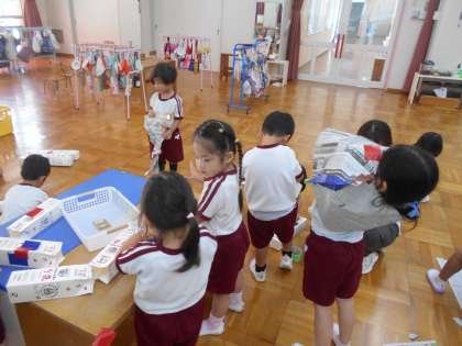 牛乳パックでは、テープを使い繋げて電車をつくったり船をつくったりして楽しんでいました。できたものを友達と見せ合って「同じものをつくってみたい!」と、教え合う姿も盛んに見られました。