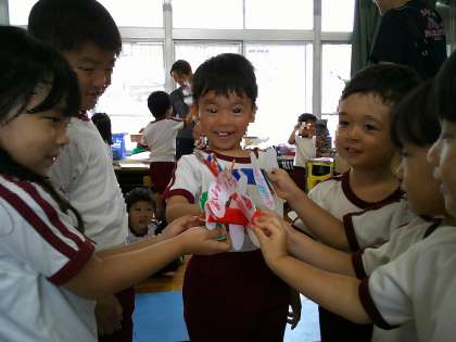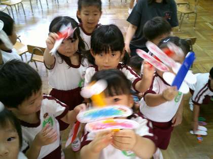 そして、つくったトンボと一緒に幼稚園をお散歩。ぱんだ組にご挨拶したり、ばら組トンボと一緒に飛んだり、さくら組やそら組の指や頭に止まったり、つき組トンボがこあら組に遊びに来てくれたり…