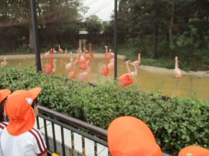 中には、キリンを見て「角2つもある!」、フラミンゴを見て「赤と白いのもいる!」など、沢山の動物達をじっくり見ながら、気づいたことや感じたことを友達や教師に知らせる姿もありました。