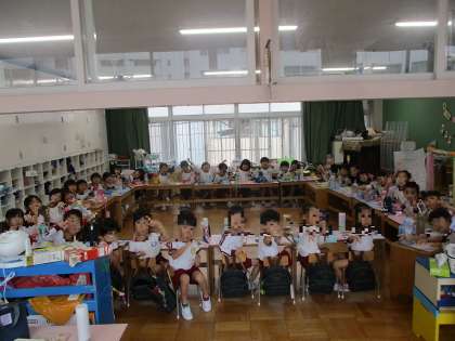 あまりない機会なので、つき組そら組と一緒に食べることにしました。それを聞いて「やった〜!!」「全員、教室に入れるの?」と大はしゃぎ。机を2クラス分並べて食べ始め、ニコニコと嬉しそうな子どもたちでした。お弁当の準備、ありがとうございました。