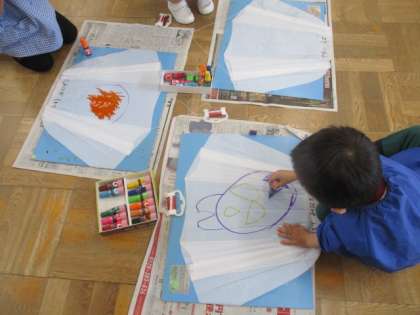 飛ばしてあそべる真っ白な凧を子どもたちに紹介しました。凧を見た子どもたちは「絵をかきたい。」「絵をかいて飛ばしたい。」という思いが出てきました。まずは、マジックペンを使って絵をかくことになりました。自分の顔をかいたり、花をかいたり、わくわくしながらかいていました。「早く飛ばしたいな。」と子どもたちは凧あげを楽しみにしていました♪