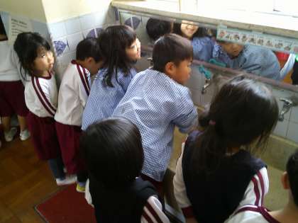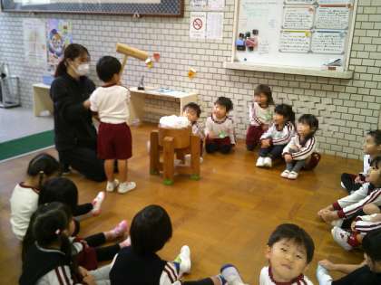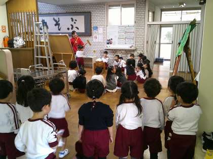 「よいしょ〜!」と楽しそうな声が聞こえたので、見に行ってみると、そら組がもちつきごっこをしていました。「もちをつくのは『きね』って言うんだよ」「こうやってつくねん」と教えてもらい、こあら組もやってみました。「きねってちょっと重いな」と言いながらついたり、友達がつく姿を見て「よいしょ〜!」とかけ声をかけたりして、もちつきごっこを楽しみました。その後、つき組・そら組がもち米を洗う様子を見に行き、「サラサラとザラザラがあった」「水が白くなったら水捨てて完成やねん」と年長さんの話を聞いて、「やってみたいな」「このもち米がどうやってもちになるのかな?」と明日のもちつきに期待をもっていました。楽しみですね!