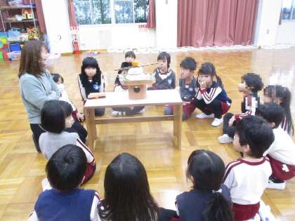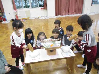 鏡餅や鏡餅に飾っている物の意味をなど少し難しい話をしましたが、興味津々に聞いていたそら組さんでした。その後は、1人1人木づちを持ってお餅を割りました。(軽くたたきました。)少し緊張気味の子どももいましたが、「楽しかった」と笑顔で感想を話してくれる子どもがほとんどでした。