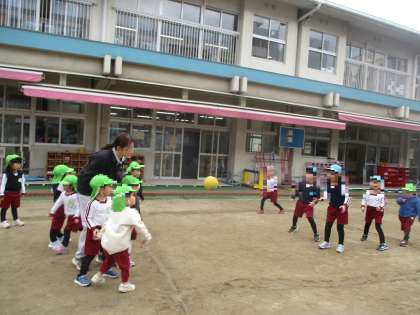 園庭では、友達と誘い合いドッジボールを楽しんでいます。遊んでいると、こあら組がやってきて「一緒にやってみる?」と問いかけて、優しくルールを教えて一緒に遊ぶ姿が見られますよ。