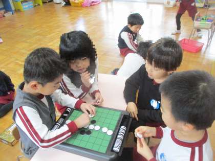 保育室では、よくオセロをしています。友達が遊んでいると周りにどんどん集まってきて友達の遊んでいる姿をみています。